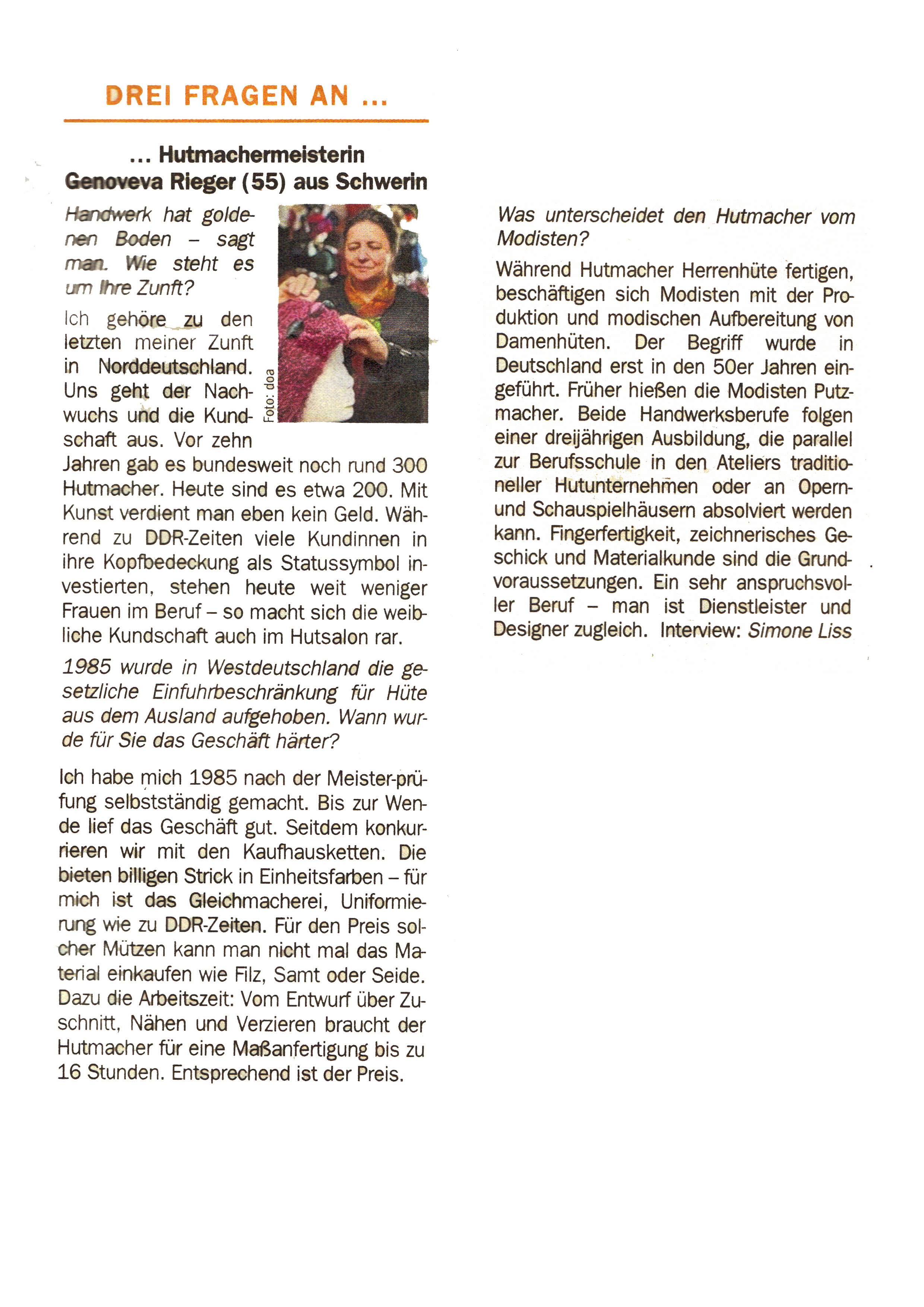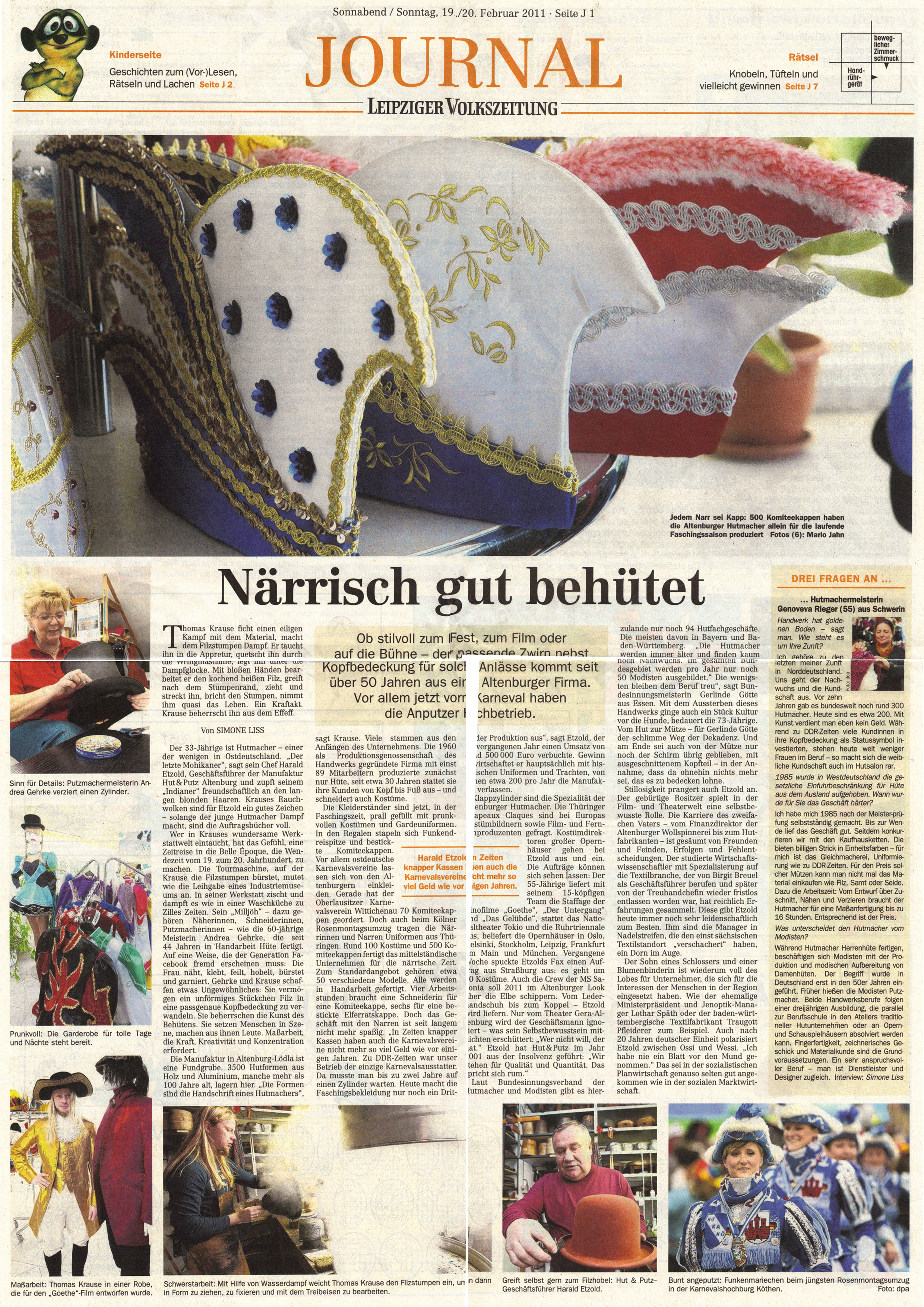 Leipziger Volkszeitung | Närrisch gut behütet - 19.02.2011 - Seite J1 - Simone Liss Drei Fragen an Genoveva Rieger. | Ges.-Artikel Teil -Artikel | |